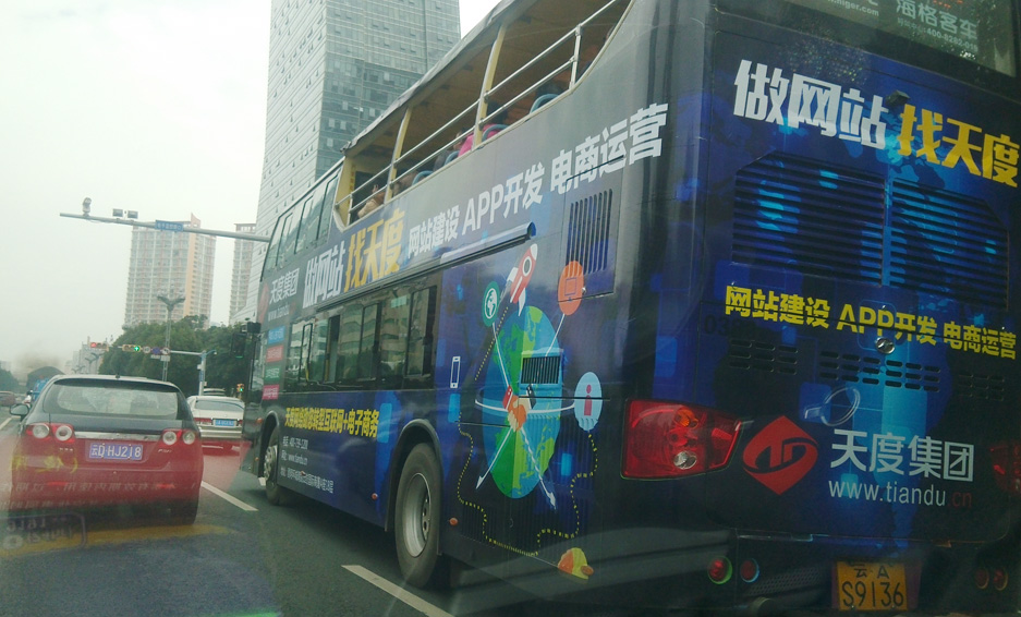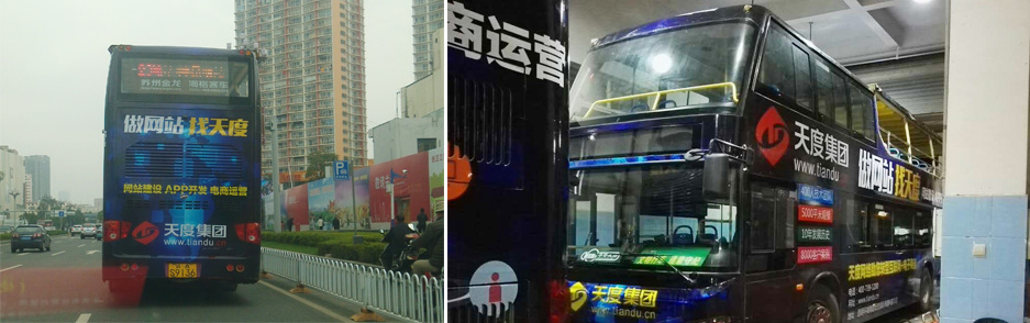 天度集團投入巨資進行了昆明全城廣告覆蓋,作為云南很具規(guī)模和品牌影響的互聯(lián)網(wǎng)企業(yè),天度為加強品牌影響力,陸續(xù)投入了昆明主要干線雙層大巴公交車車身廣告、車內(nèi)靠背廣告、公交車電視廣告、機場大巴雜志封面廣告、市區(qū)基地各大路牌燈箱廣告、電梯廣告、市基地戶外LED大屏廣告、新高速收費站廣告、影院LED廣告、商圈燈箱廣告、樓宇燈箱廣告、KTV燈箱廣告、平面報刊廣告、網(wǎng)絡廣告等。相信本輪廣告的投放,將加大云南企業(yè)家對互聯(lián)網(wǎng)轉(zhuǎn)型的認識,并促進天度公司的快速發(fā)展。