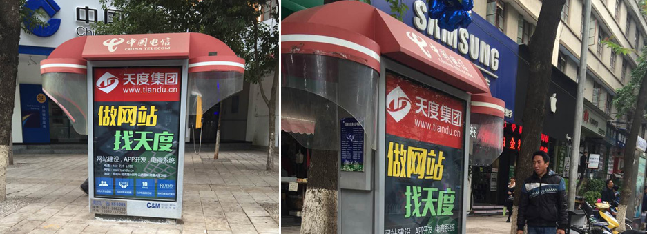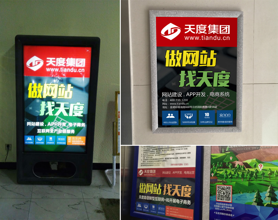天度集團在昆明市滇池路、金碧路、人民中路、北京路、青年路、西昌路等所有市基地骨干道路投入了路牌燈箱廣告。