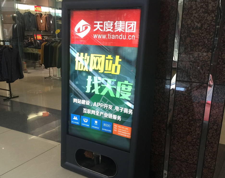 天度集團在180個商城投入了巨幅燈箱廣告,覆蓋了昆明主城區(qū)絕大多數(shù)商城和城市綜合體樓宇。