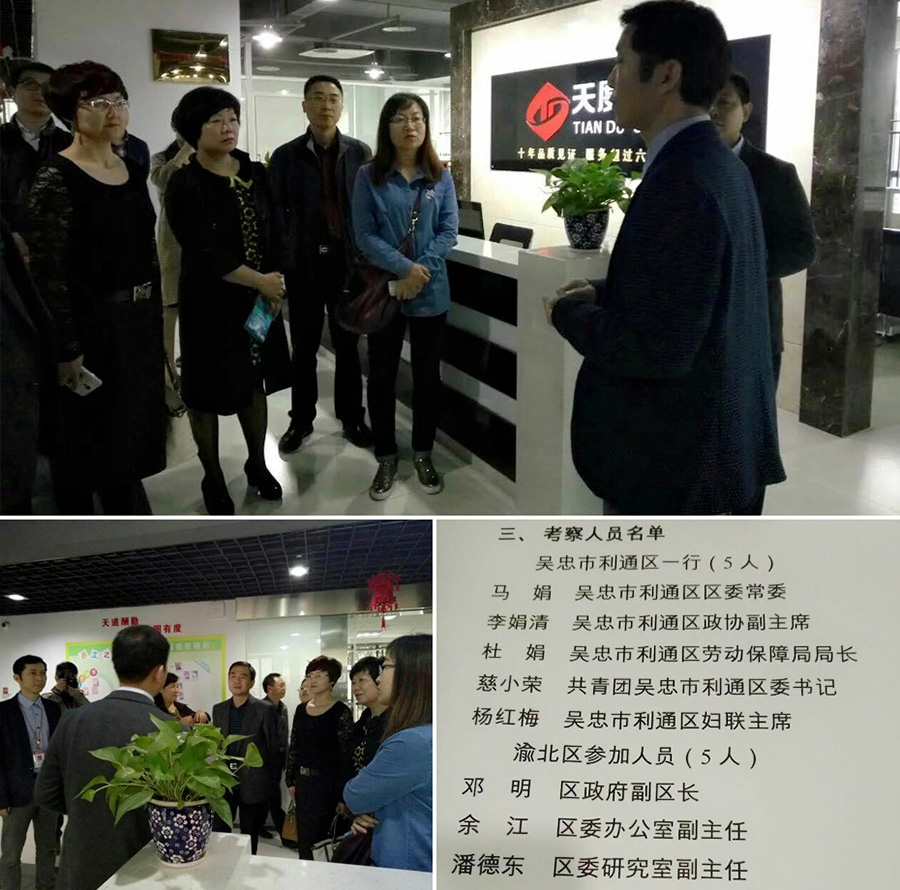 2016年4月23日上午,寧夏吳忠市利通區(qū)區(qū)委常委馬娟、政協(xié)副主席李娟清一行十余人在渝北區(qū)副區(qū)長鄧明陪同下蒞臨重慶天度網(wǎng)絡信息技術(shù)有限公司進行考察調(diào)研,各位領(lǐng)導對天度的發(fā)展情況及項目成果轉(zhuǎn)化能力進行了考察和調(diào)研。
