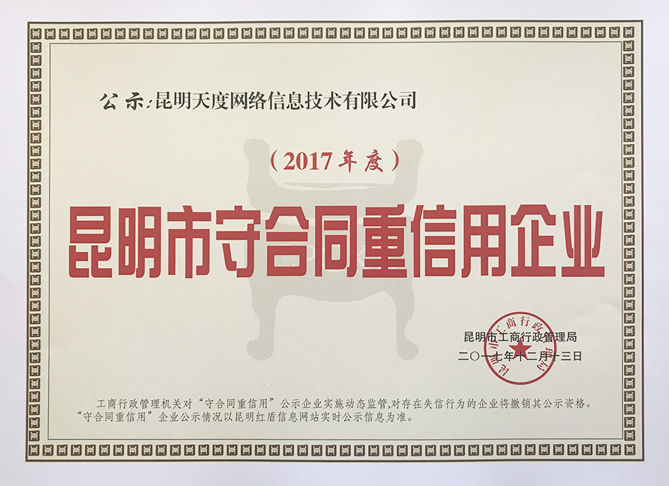天度網(wǎng)絡(luò)公司被評為昆明市守合同重信用企業(yè)