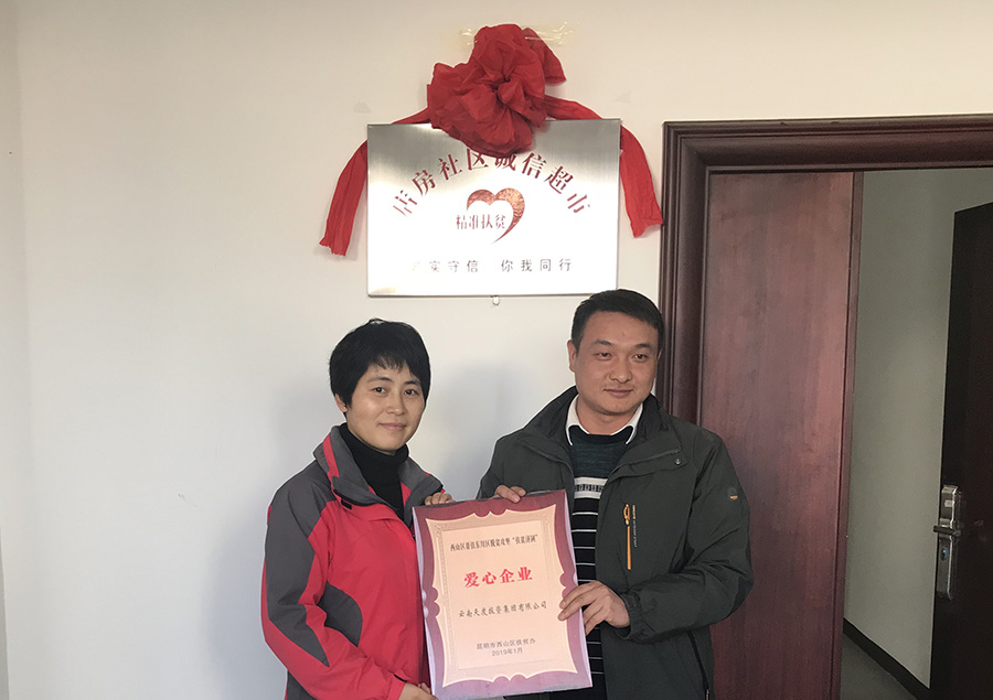 西山區(qū)科技局局長王敬紅、烏龍鎮(zhèn)鎮(zhèn)長楊勇、人大主席肖嬋姬、西山區(qū)扶貧辦領(lǐng)導(dǎo)等出席了捐贈儀式。店房村黨支部馬書記、店房村委會馬主任與楊總、宮副總一同對愛心超市進(jìn)行揭牌。
