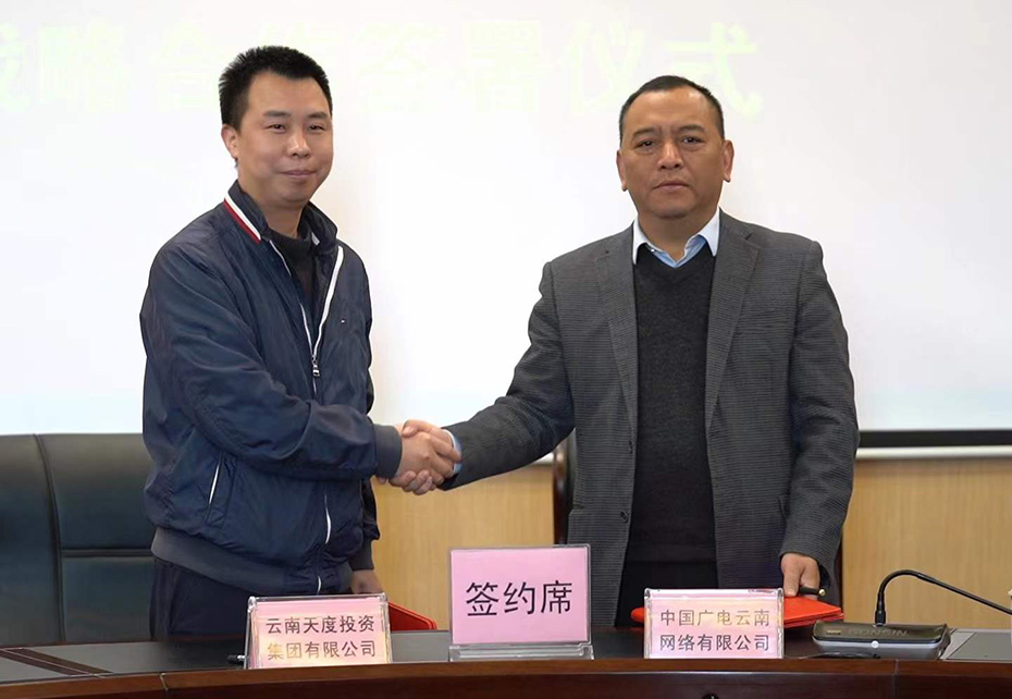 2月17日上午,中國廣電云南網(wǎng)絡(luò)有限公司與云南天度投資集團(tuán)有限公司《戰(zhàn)略合作協(xié)議》簽署儀式在中國廣電云南網(wǎng)絡(luò)有限公司總部A座19樓舉行,雙方將在“文化固邊、電商興邊”、數(shù)字化服務(wù)及直播電商等新業(yè)態(tài)、新領(lǐng)域展開全面深入合作。中國廣電云南網(wǎng)絡(luò)有限公司總經(jīng)理趙聯(lián)濤,云南天度投資集團(tuán)有限公司董事長(zhǎng)鄭桂文分別代表雙方簽署協(xié)議。