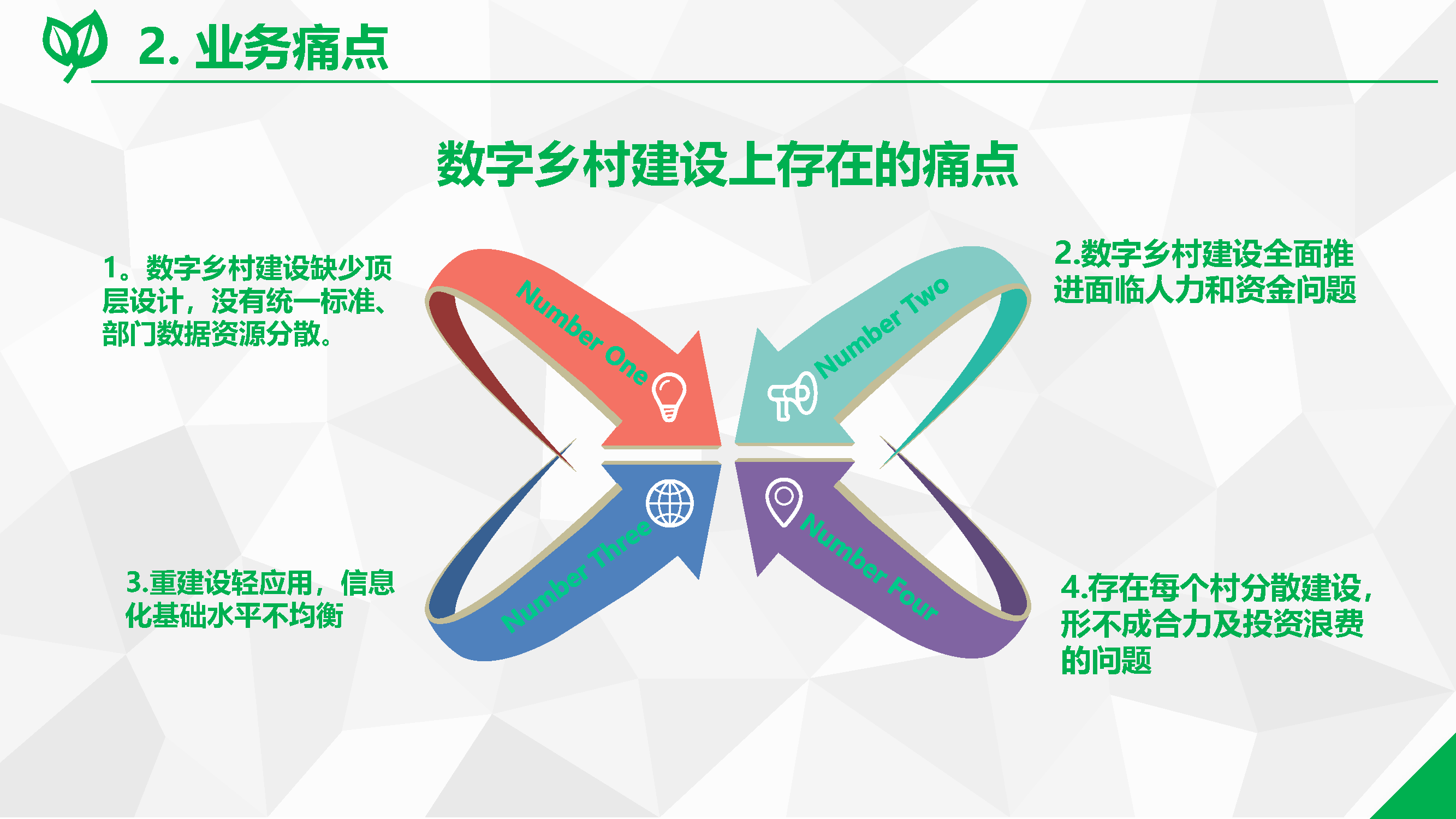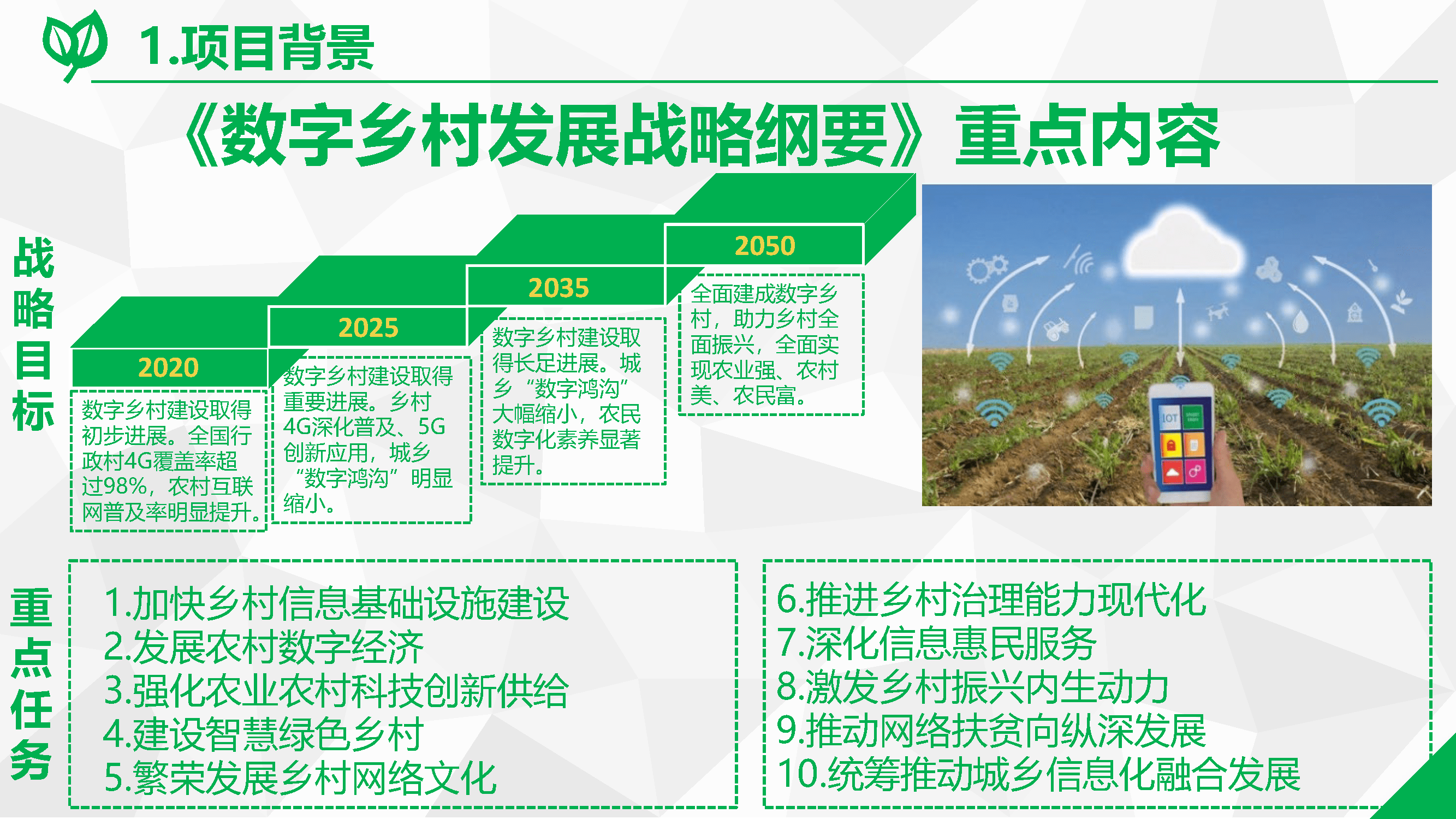 1、數(shù)字鄉(xiāng)村整體規(guī)劃:因地制宜地編制縣域數(shù)字鄉(xiāng)村建設(shè)規(guī)劃,做好整體設(shè)計,明確發(fā)展定位、建設(shè)目標、重點任務(wù)及工程和實施步驟,完善配套政策措施,統(tǒng)籌推進數(shù)字鄉(xiāng)村和智慧城市建設(shè),有效發(fā)揮信息技術(shù)創(chuàng)新的擴散效應、信息和知識的溢出效應、數(shù)字技術(shù)釋放的普惠效應,促進城鄉(xiāng)融合發(fā)展。