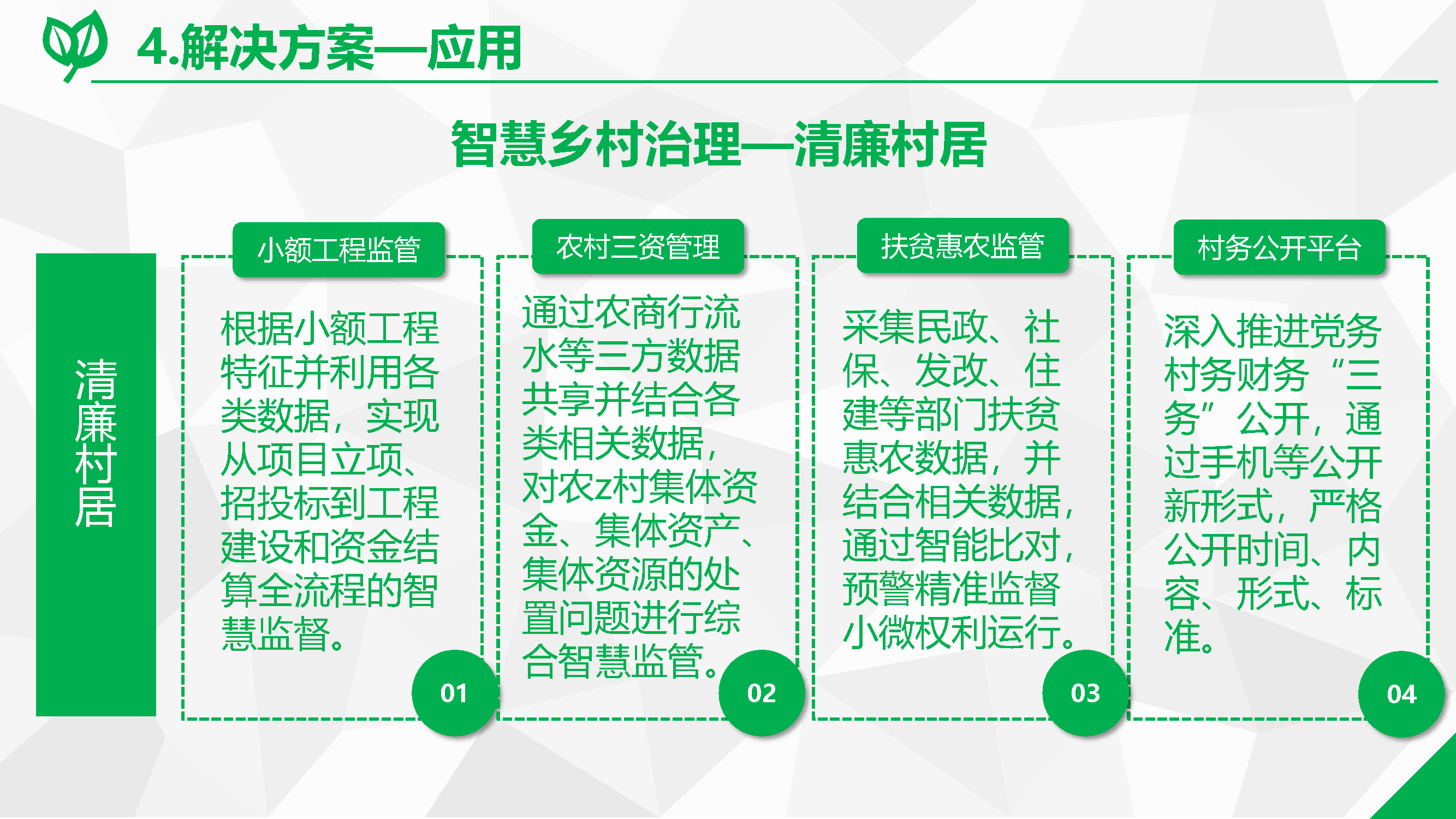 根據(jù)鄉(xiāng)村振興戰(zhàn)略的總體部署,鄉(xiāng)村治理工作應著重提升智能化、精細化與專業(yè)化水平。因此,結(jié)合自身的數(shù)字化應用開發(fā)能力,聚焦智慧黨建、村鎮(zhèn)環(huán)境保護,以及城鎮(zhèn)綜合行政執(zhí)法工作的數(shù)字化,為縣域建立健全數(shù)字治理新模式提供支撐。