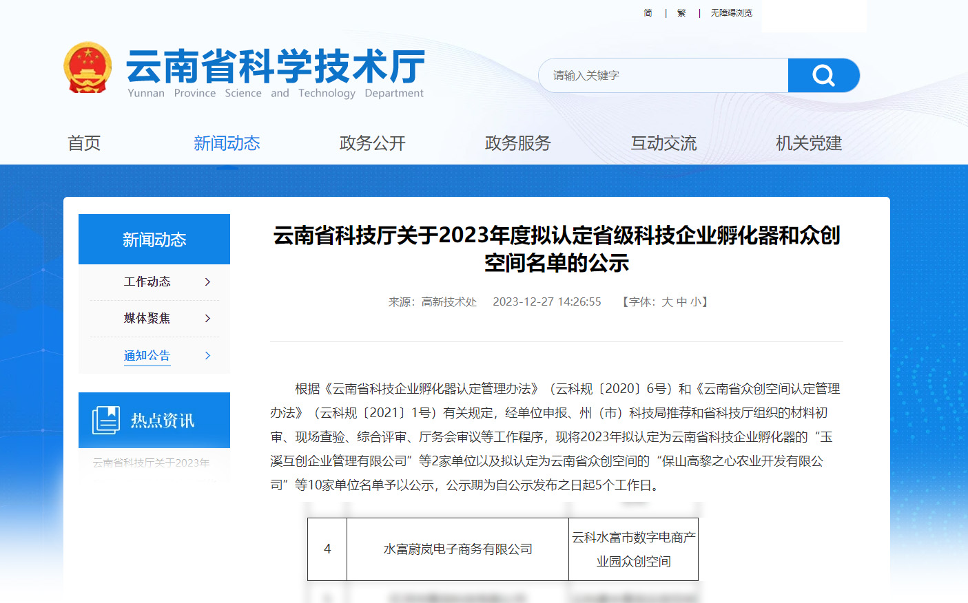 根據(jù)《云南省科技企業(yè)孵化器認(rèn)定管理辦法》(云科規(guī)〔2020〕6號(hào))和《云南省眾創(chuàng)空間認(rèn)定管理辦法》(云科規(guī)〔2021〕1號(hào))有關(guān)規(guī)定,經(jīng)單位申報(bào)、州(市)科技局推薦和省科技廳組織的材料初審、現(xiàn)場(chǎng)查驗(yàn)、綜合評(píng)審、廳務(wù)會(huì)審議等工作程序,天度集團(tuán)旗下水富蔚嵐電子商務(wù)有限公司獲“省級(jí)眾創(chuàng)空間”認(rèn)定。目前公司已獲得昭通市科技局“昭通市數(shù)字電商科技企業(yè)孵化器”、省工信廳“2022年度中小企業(yè)公共服務(wù)示范平臺(tái)”等多項(xiàng)認(rèn)定和榮譽(yù)。