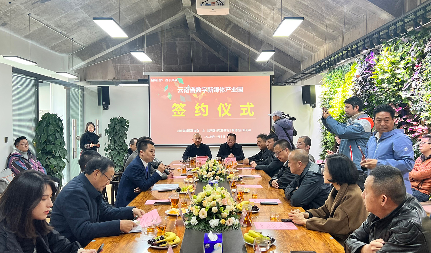2024年1月10日下午,云南省新媒體協(xié)會會長鄭桂文與昆明譽恒軟件基地開發(fā)建設有限公司董事長周曉東在昆明經(jīng)開區(qū)簽訂《合作協(xié)議》,雙方將共同建設運營“云南省數(shù)字新媒體產(chǎn)業(yè)園”,合力打造7.6萬平方米規(guī)模的數(shù)字新媒體產(chǎn)業(yè)集聚區(qū)、生態(tài)區(qū)、服務區(qū)。