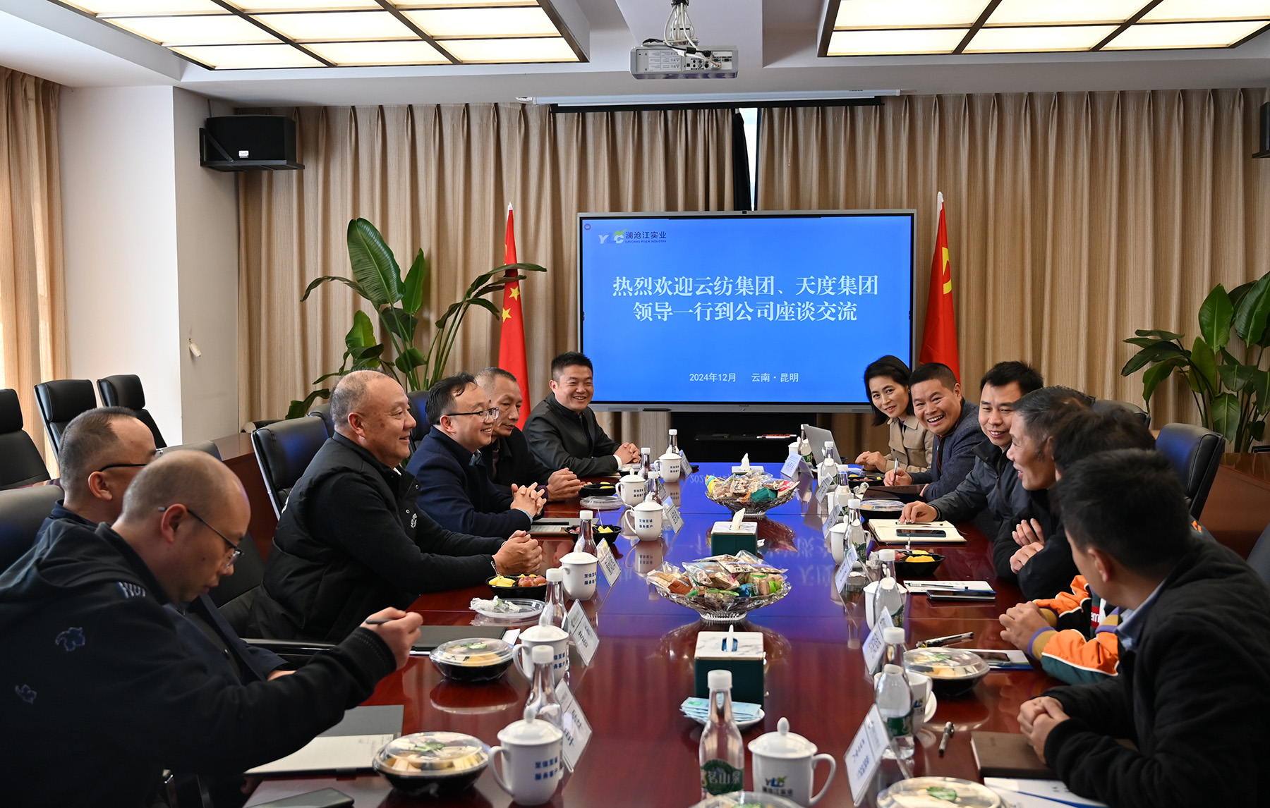 12月12日,云紡集團黨委副書記、紀委書記李俊,天度集團董事長鄭桂文一行到云南瀾滄江實業(yè)有限公司開展業(yè)務(wù)座談交流。云南瀾滄江實業(yè)有限公司董事長董燦輝、總裁金克斌、執(zhí)行總裁葛彬及辦公室、招投標中心、昆明分公司相關(guān)負責人參加座談。三方圍繞開展務(wù)實合作、實現(xiàn)發(fā)展共贏進行深入交流。